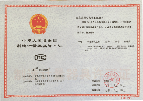 我公司是青島市具有國家質(zhì)量技術(shù)監(jiān)督部門頒發(fā)的計(jì)量器具生產(chǎn)許可證的生產(chǎn)企業(yè);獲得國家防爆電氣產(chǎn)品質(zhì)量監(jiān)督檢驗(yàn)中心頒發(fā)的防爆合格證;獲得國家公安部消防產(chǎn)品合格評定中心頒發(fā)的消防產(chǎn)品形式認(rèn)可證書。